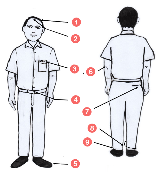 - Hair should be cut short and combed to the side.